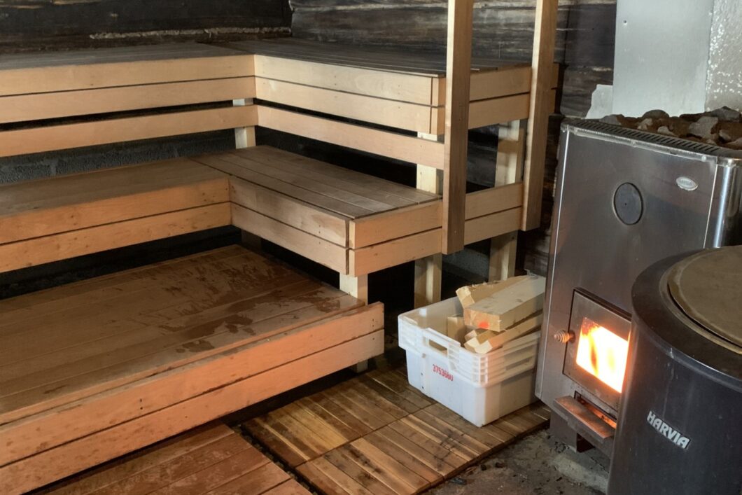 Puulämmitteinen sauna, joka mahdollistaa saunomisen yhdessä ison ystäväjoukon tai perheen kera. Suihkut ja wc.