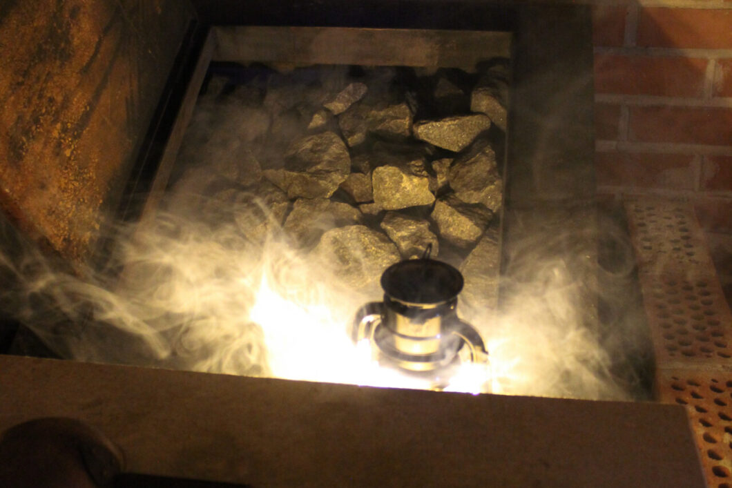 perinteisen saunaelämyksen. Puukiuas ja puilla lämmitettävä vesipata.